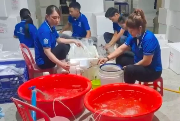 Công nhân chuẩn bị tôm giống để xuất khẩu sang Đài Loan