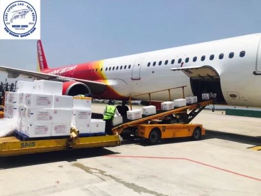 Đưa lô tôm giống Mebi One lên máy bay để vận chuyển sang Đài Loan